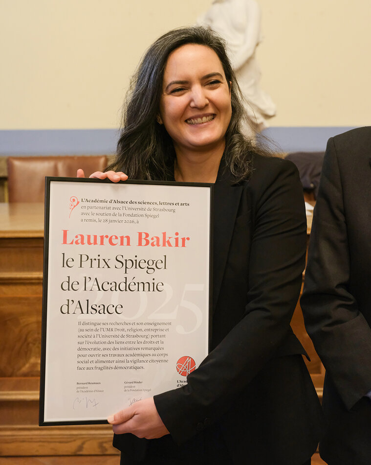Ce nouveau prix récompense les travaux d’un.e jeune chercheur.se en sciences humaines et sociales pour sa contribution décisive au bien commun. La candidature de Lauren Bakir, soutenue par la marraine et directrice de l’UMR DRES Mélanie Schmitt, a recueilli l’adhésion du jury pour son engagement à produire des savoirs juridiques rigoureux et critiques, et sa conviction de l’utilité sociale de la recherche. Consacrés aux droits humains et aux libertés fondamentales en contexte démocratique, les travaux de Lauren Bakir poursuivent l’ambition de « dépassionner les débats dans la société civile ».