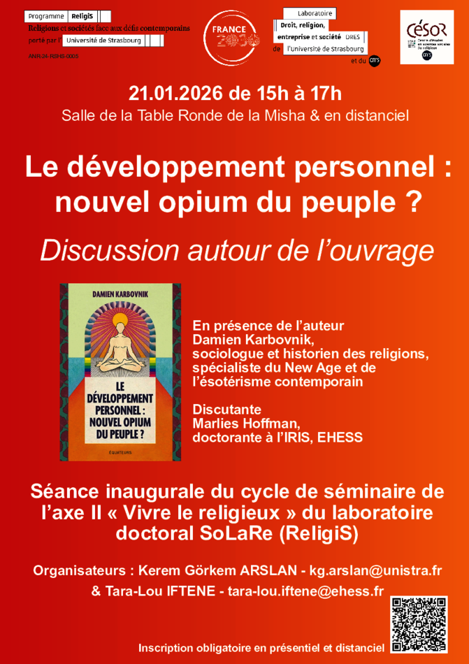 Cette première séance sera consacrée à une discussion autour de l’ouvrage Le développement personnel : nouvel opium du peuple ? de Damien Karbovnik, sociologue et historien des religions au sein de l’UMR 3400 ARCHE, spécialiste du New Age et de l’ésotérisme contemporain.