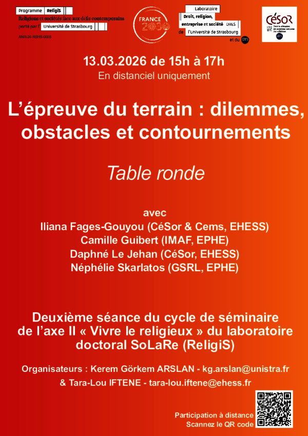 L’épreuve du terrain : dilemmes, obstacles et contournements Deuxième séance du cycle de séminaire de l’axe II « Vivre le religieux » du laboratoire doctoral SoLaRe (ReligiS) 13 mars 2026 15h 17h En ligne