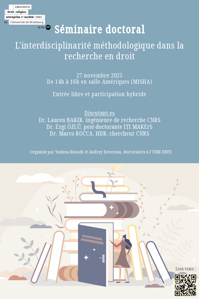 - 27 novembre, 14h-16h (salle Amériques, MISHA) -L'interdisciplinarité méthodologique dans la recherche en droit avec Lauren Bakir, Ezgi Özlü et Marco Rocca